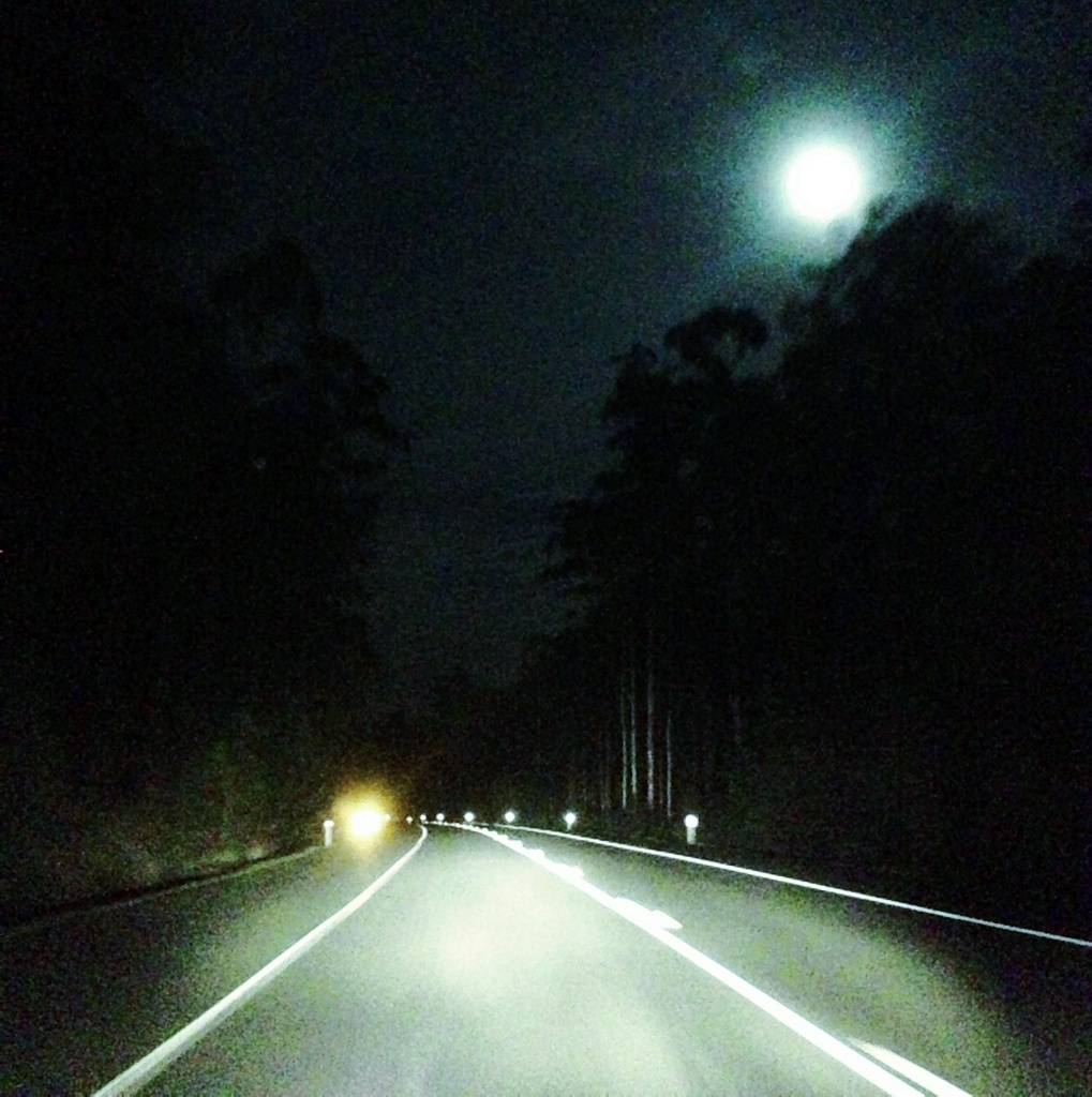 On the road through a scary forest, guided by the moon…